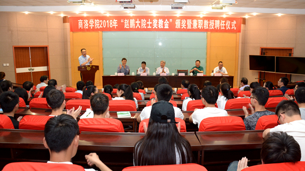 赵鹏大院士为获得2018年“赵鹏大院士奖教金”的三名教师元飞、乔成芳、曹宝月颁奖,并发表了情真意切的讲话。他讲到,他对商洛学院有着深厚的感情,每次到商洛学院都有回家的感觉。他对获奖教师表示祝贺,并指出,获奖教师为学校发展、相关学科发展、国家建设做出了贡献,在成才的道路上又迈进了一大步,但除了他们三位之外,还有很多科研工作者奋战在各自的领域,并取得了很多成就。他指出,我们目前在各学科的研究领域都取得了很多重大成果,但距离将我国建设成为世界科技强国这一目标依然任重道远,我们要坚持创新,要将重大科技成果牢牢把握在自己手中,不仅要做一个“论文大国”,还要将自己的知识产业化,形成生产力,服务于社会,服务于人民,要戒骄戒躁、再接再厉,做出彩事、做平凡人,为把我国建设成为科技强国而不懈奋斗,为学校发展和民族复兴做出更大的贡献。