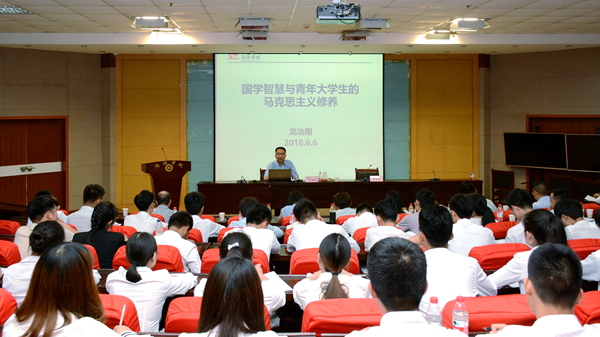 龙治刚从狭义和广义两个角度为同学们讲解了国学的含义,并以四部分类法对国学进行分类,简要介绍了《经》《史》《子》《集》各部的主要内容。他引用邓卫东的国学史观,结合自己的亲身感受,从不同侧面,用生动的事例、精辟的语言全方位阐述了“自然国学,生命国学,家庭国学,公益国学”。他以孔子的人生经历为背景,重点讲述了儒家思想“仁”“礼”“中庸”“义”“信”的深刻内涵,点面结合,将中国传统思想文化里的国学智慧娓娓道来。此外,龙治刚还从修身之道、廉政之道、法治之道、民本之道等七个方面入手,结合儒释道文化起源和核心思想,巧妙地将优秀传统文化、现代教育理念、当代青年的马克思主义修养融贯一体,以生动有趣的语言引领青年大学生了解中华优秀传统文化中的思想精华,引导青年学子树立正确的世界观、人生观和价值观。