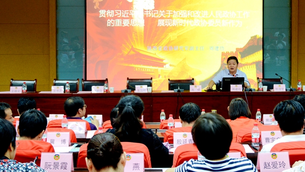 省政协研究室副主任周建功以《贯彻习近平总书记关于加强和改进人民政协工作的重要思想展现新时代政协委员新作为》为题为与会人员作专题辅导报告,他在报告中详细解读了习近平总书记关于加强和改进人民政协工作的重要思想,全面回顾了人民政协69年的光辉发展历程,并就政协章程的修改、政协的十项经常性工作、政协委员履职的基本要求等几个方面作了深入系统的讲解。