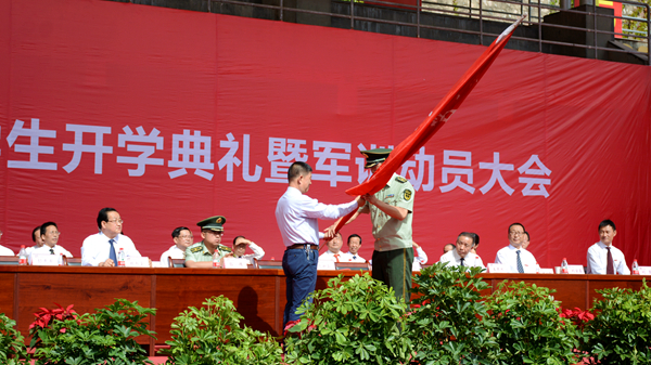 范新会为2018级学生军训团授予团旗,吕喆代表学生军训团接旗。