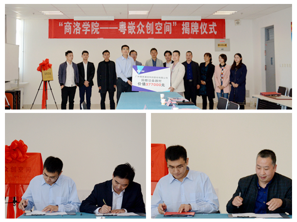 电信学院副院长刘爱军、经管学院副院长贾长安分别代表各自院部与粤嵌科技王乐忠签署众创空间合作协议,教务处副处长高扩昌代表学校接收粤嵌科技捐赠的总价值达75万元的教学仪器与设备。