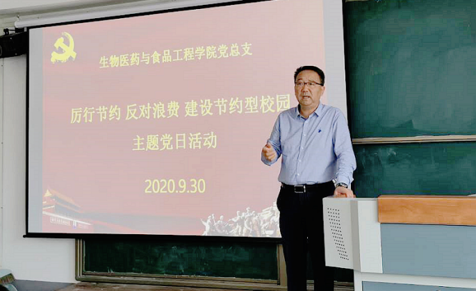 9月30日,校党委书记龙治刚深入生物学院党总支,参加 “厉行节约,反对浪费,建设节约型校园”主题党日活动,带领全体党员学习了《中国共产党基层组织选举工作条例》及习近平总书记关于厉行节约、反对浪费重要指示精神,与大家一道学习观看了《焦点访谈》“一粥一饭不易且重大”电视节目,并带头在“我倡议、我践行”留言板上写下“传承美德、勤俭节约、珍惜粮食、从我做起”16字感言,教育引导党员师生爱惜粮食、以勤俭节约为荣。