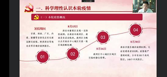 为深化大学生思想政治教育,强化师生疫情防控意识,引导广大青年学生严格落实疫情防控各项工作要求,弘扬伟大抗疫精神,以实际行动迎接党的二十大胜利召开,8月31日下午,校领导张志昌、范新会、彭虎军、刘勇、刘宝盈、王新军、郭瑾以“云端授课”的形式,为全体学生讲授“开学第一课”。